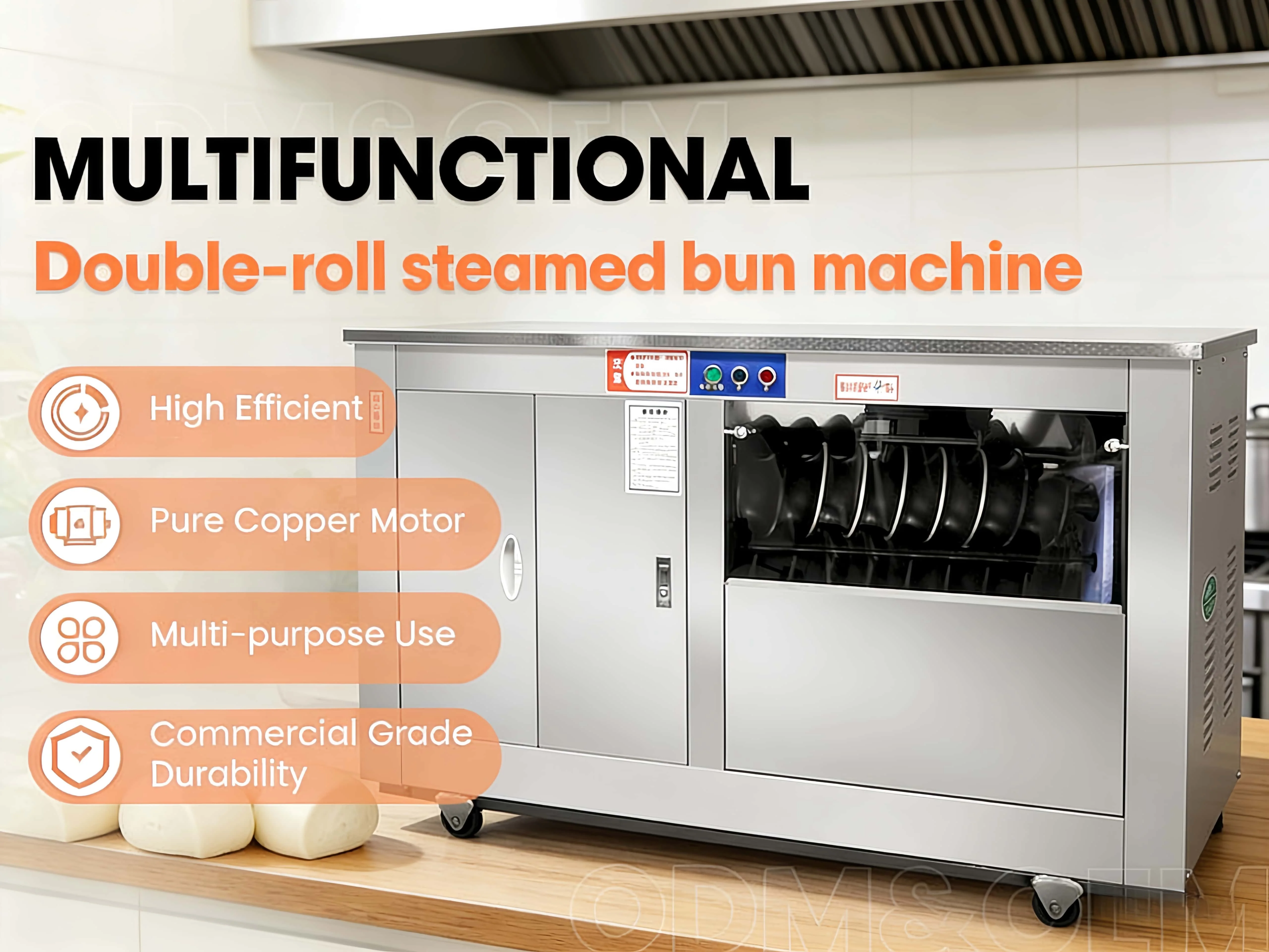 The double-roller steamed bun machine is an efficient food processing equipment specially designed for large-scale and standardized production of steamed buns. Its core features are "double-roller extrusion forming and one-click batch production".It solves the pain points of traditional manual steamed bun making, such as low efficiency, uneven size, and inconsistent taste.It is widely applicable to commercial scenarios such as canteens, steamed bun workshops, noodle restaurants, and food processing factories. It balances production efficiency and product quality, and is the core equipment for batch production of pasta such as steamed buns and flower rolls. It easily realizes the rapid conversion of steamed buns from dough to finished products, greatly saving labor costs.